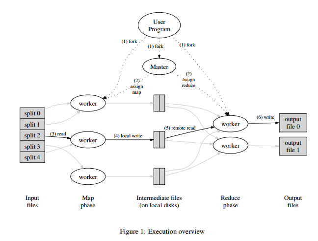 MapReduce库首先将输入文件分成M段,每段通常16MB-64MB,然后在集群的机器上开启程序的许多副本(图中fork成worker和master)。